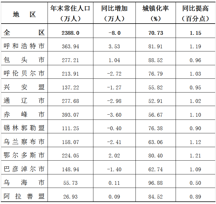全區(qū)常住人口中,城鎮(zhèn)人口1689萬人,比2023年增加21.9萬人;鄉(xiāng)村人口699萬人,比2023年減少29.9萬人。常住人口城鎮(zhèn)化率70.73%,比2023年提高了1.15個百分點。
