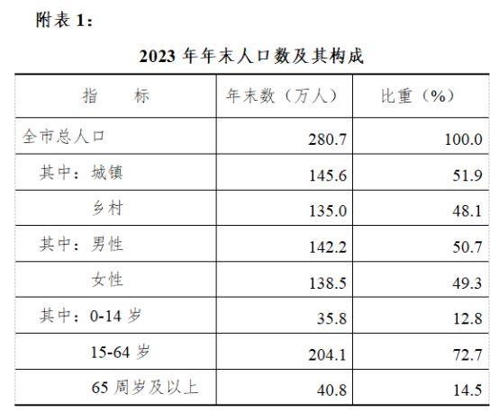 年末全市常住人口280.7萬(wàn)人,比上年末減少2.8萬(wàn)人。其中,城鎮(zhèn)人口145.6萬(wàn)人,鄉(xiāng)村人口135.0萬(wàn)人;常住人口城鎮(zhèn)化率為51.9%,比上年提高0.9個(gè)百分點(diǎn)。男性人口142.2萬(wàn)人,女性人口138.5萬(wàn)人。全年出生人口1.4萬(wàn)人,出生率為4.98‰;死亡人口2.7萬(wàn)人,死亡率為9.61‰;人口自然增長(zhǎng)率為-4.64‰。