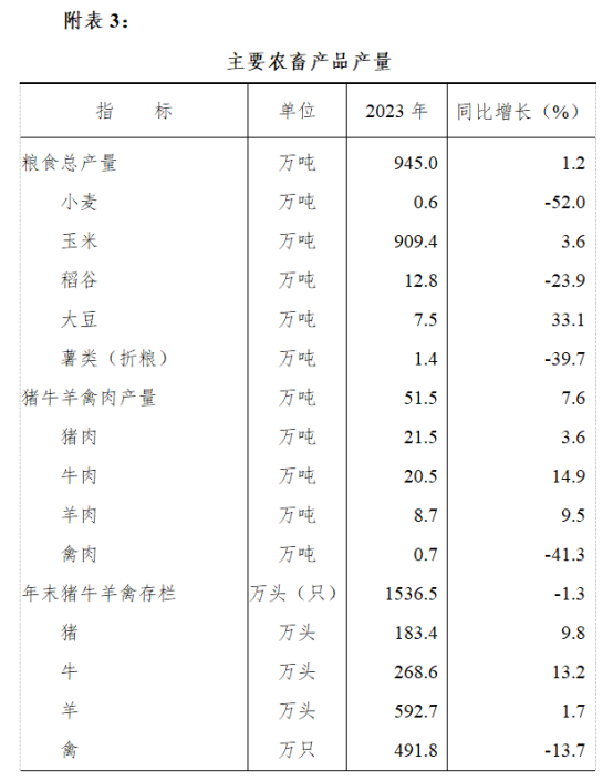 全年糧食作物播種面積126.2萬(wàn)公頃,比上年增加0.3萬(wàn)公頃,增長(zhǎng)0.2%。其中,玉米播種面積116.6萬(wàn)公頃,比上年增加3.8萬(wàn)公頃,增長(zhǎng)3.4%;稻谷播種面積1.6萬(wàn)公頃,比上年減少0.5萬(wàn)公頃,下降25.3%;小麥播種面積0.1萬(wàn)公頃,比上年減少0.1萬(wàn)公頃,下降49.5%;高粱播種面積1.0萬(wàn)公頃,比上年減少1.1萬(wàn)公頃,下降52.2%;蕎麥播種面積0.1萬(wàn)公頃,比上年減少0.2萬(wàn)公頃,下降57.3%;大豆播種面積4.3萬(wàn)公頃,比上年增加1.5萬(wàn)公頃,增長(zhǎng)51.2%。