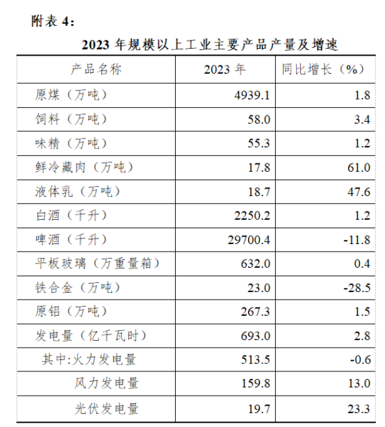 從規(guī)模以上工業(yè)主要產(chǎn)品產(chǎn)量看,原煤產(chǎn)量4939.1萬(wàn)噸,比上年增長(zhǎng)1.8%;發(fā)電量693.0億千瓦時(shí),增長(zhǎng)2.8%;原鋁產(chǎn)量267.3萬(wàn)噸,增長(zhǎng)1.5%;味精產(chǎn)量55.3萬(wàn)噸,增長(zhǎng)1.2%;液體乳產(chǎn)量18.7萬(wàn)噸,增長(zhǎng)47.6%;鮮、冷藏肉產(chǎn)量17.8萬(wàn)噸,增長(zhǎng)61.0%;平板玻璃產(chǎn)量632.0萬(wàn)重量箱,增長(zhǎng)0.4%。