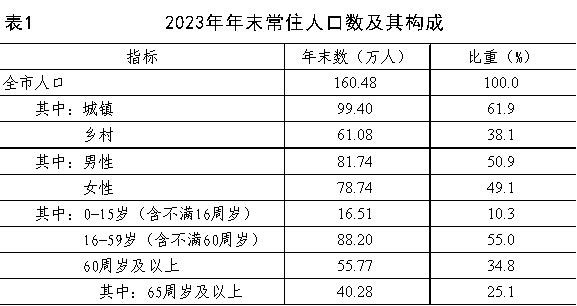 據(jù)抽樣調(diào)查統(tǒng)計,年末全市常住人口160.48萬人,其中:城鎮(zhèn)人口99.4萬人,鄉(xiāng)村人口61.08萬人。常住人口城鎮(zhèn)化率為61.94%。全年出生人口0.59萬人,出生率為3.63‰;死亡人口為1.84萬人,死亡率為11.39‰;人口自然增長率為-7.76‰。