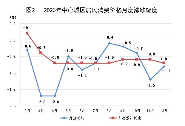 全年中心城區(qū)居民消費價格比上年下降1.0%。分類別看,食品煙酒類上漲0.4%,衣著類上漲1.9%,居住類下降4.3%,生活用品及服務類下降0.6%,交通和通信類下降3.8%,教育文化和娛樂類上漲1.3%,醫(yī)療保健類上漲0.6%,其他用品和服務類上漲3.8%。