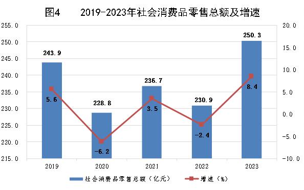 2023年,全市社會消費品零售額250.3億元,比上年增長8.4%。按經(jīng)營地分,城鎮(zhèn)消費品零售額211.1億元,增長8.3%;鄉(xiāng)村消費品零售額39.3億元,增長9.0%。按消費形態(tài)分,商品零售額215.8億元,增長6.9%。餐飲收入34.5億元,增長19.2%。