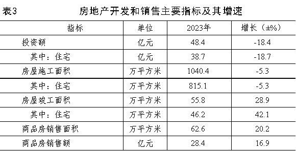 全年房地產(chǎn)開發(fā)企業(yè)投資完成額48.4億元,比上年下降18.4%,其中住宅投資完成額38.7億元,下降18.7%。商品房銷售面積62.6萬平方米,增長20.2%,商品房銷售額28.4億元,增長16.9%。