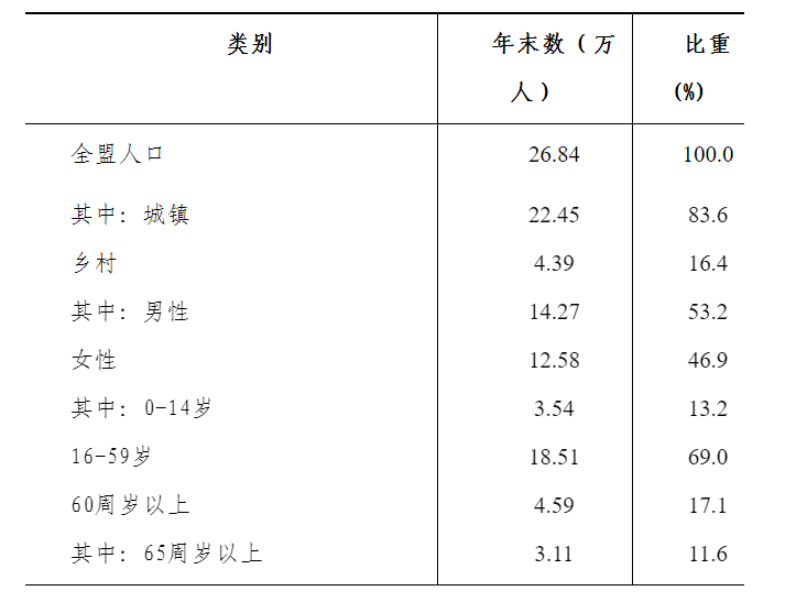 年末全盟常住人口26.84萬人,比上年末減少0.06萬人。常住人口城鎮(zhèn)化率達83.63%,比上年末提高0.91個百分點。全年出生人口0.15萬人,出生率為5.40‰;人口死亡率為6.79‰;人口自然增長率為-1.39‰。
