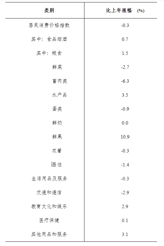 全年居民消費價格比上年下降0.3%。分類別看,食品煙酒類上漲0.7%、衣著類下降0.3%、居住類下降1.4%、生活用品及服務(wù)類下降0.3%、交通通信類下降2.9%、教育文化和娛樂類上漲2.9%、醫(yī)療保健類上漲0.1%、其他用品和服務(wù)類上漲3.1%。