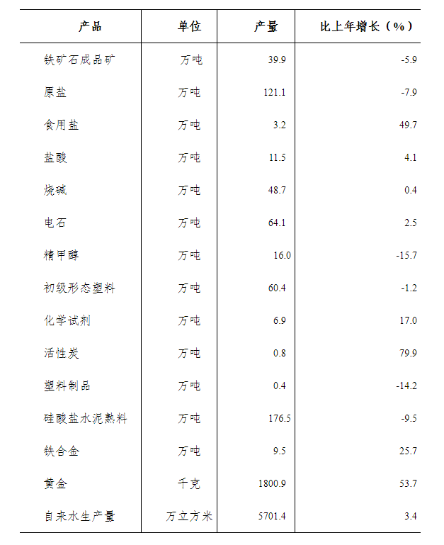 從主要產(chǎn)品產(chǎn)量看,全盟原鹽產(chǎn)量達121.1萬噸,比上年下降7.9%;鹽酸產(chǎn)量達11.5萬噸,增長4.1%;電石產(chǎn)量達64.1萬噸,增長2.5%。