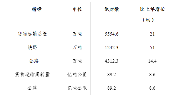 全年完成貨物運輸總量5554.6萬噸,比上年增長21%。完成貨物運輸周轉(zhuǎn)量89.2億噸公里,比上年增長8.6%。