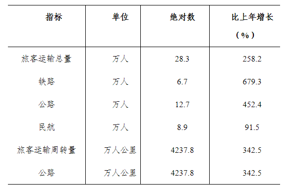 全年完成旅客運輸總量28.3萬人,比上年增長258.2%。完成旅客運輸周轉(zhuǎn)量4237.8萬人公里,比上年增長342.5%。