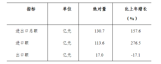 全年海關(guān)進出口總額130.7億元(人民幣,下同),比上年增長157.6%,其中:進口額113.6億元,增長276.5%;出口額17.0億元,下降17.1%。