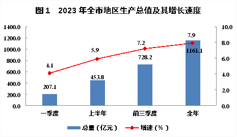 初步核算,2023年全市地區(qū)生產(chǎn)總值1161.1億元,同比增長7.9%②。其中,第一產(chǎn)業(yè)增加值309.9億元,同比增長7.9%;第二產(chǎn)業(yè)增加值378.5億元,同比增長8.9%;第三產(chǎn)業(yè)增加值472.6億元,同比增長7.4%。三次產(chǎn)業(yè)比例為26.7:32.6:40.7。第一、二、三產(chǎn)業(yè)對(duì)地區(qū)生產(chǎn)總值增長的貢獻(xiàn)率分別為25.9%、32.2%、41.9%。人均地區(qū)生產(chǎn)總值達(dá)到76893元,同比增長9.0%。