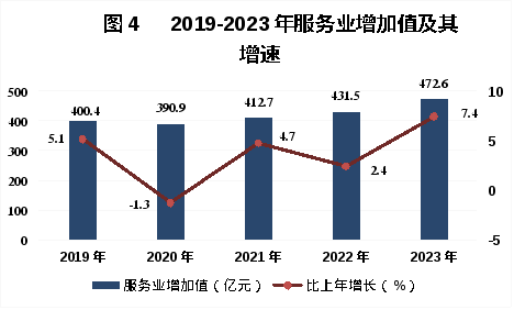 全年全市批發(fā)和零售業(yè)增加值80.8億元,同比增長11.3%;交通運(yùn)輸、倉儲(chǔ)和郵政業(yè)增加值94.2億元,同比增長13.3%;住宿和餐飲業(yè)增加值16.0億元,同比增長19.9%;金融業(yè)增加值53.4億元,同比增長10.1%;房地產(chǎn)業(yè)增加值28.1億元,同比增長2.1%。規(guī)模以上服務(wù)業(yè)實(shí)現(xiàn)營業(yè)收入56.8億元,同比增長15.5%。