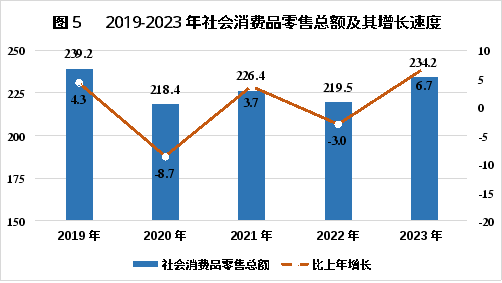 全年社會(huì)消費(fèi)品零售總額234.2億元,同比增長6.7%。按銷售單位所在地統(tǒng)計(jì),城鎮(zhèn)實(shí)現(xiàn)消費(fèi)品零售額188.5億元,同比增長6.4%;鄉(xiāng)村實(shí)現(xiàn)消費(fèi)品零售額45.7億元,同比增長8.1%。按消費(fèi)形態(tài)統(tǒng)計(jì),商品零售額206.7億元,同比增長4.9%;餐飲收入27.5億元,同比增長22.9%。
