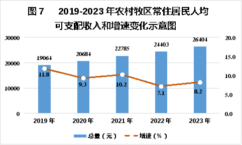 全年全體常住居民人均可支配收入34188元,同比增長6.3%。按常住地分,城鎮(zhèn)常住居民人均可支配收入40804元,增長6.1%。從主要收入構(gòu)成看,工資性收入23300元,增長4.1%;經(jīng)營凈收入9064元,增長14.2%;財(cái)產(chǎn)凈收入1588元,增長1.8%;轉(zhuǎn)移凈收入6852元,增長4.2%。農(nóng)村牧區(qū)常住居民人均可支配收入26404元,增長8.2%。從主要收入構(gòu)成看,工資性收入3338元,增長10.1%;經(jīng)營凈收入18958元,增長7.9%;財(cái)產(chǎn)凈收入404元,增長19.9%;轉(zhuǎn)移凈收入3704元,增長6.9%。