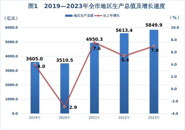 初步核算,全年地區(qū)生產(chǎn)總值[2]5849.86億元,扣除價(jià)格因素影響,同比增長(zhǎng)7.0%。其中,第一產(chǎn)業(yè)增加值為202.60億元,同比增長(zhǎng)6.3%;第二產(chǎn)業(yè)增加值為3938.56億元,同比增長(zhǎng)5.7%;第三產(chǎn)業(yè)增加值為1708.69億元,同比增長(zhǎng)8.9%。三次產(chǎn)業(yè)結(jié)構(gòu)為3.5:67.3:29.2。第一、二、三產(chǎn)業(yè)對(duì)地區(qū)生產(chǎn)總值的貢獻(xiàn)率分別為3.4%、48.1%、48.5%。人均地區(qū)生產(chǎn)總值達(dá)到264699元,同比增長(zhǎng)5.7%。