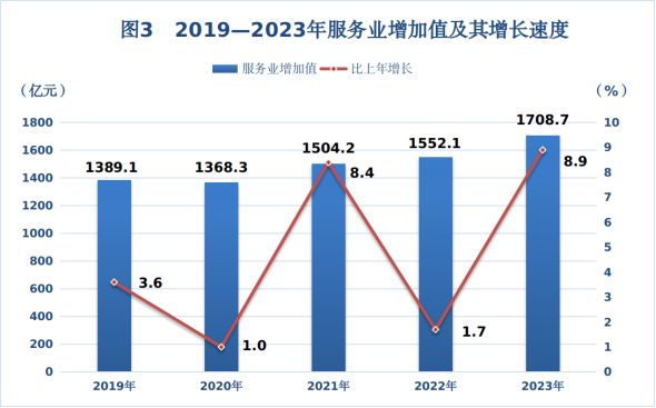 全年服務(wù)業(yè)增加值1708.7億元,同比增長(zhǎng)8.9%。批發(fā)和零售業(yè)增加值299.8億元,同比增長(zhǎng)5.7%;住宿和餐飲業(yè)增加值68.0億元,同比增長(zhǎng)20.9%;交通運(yùn)輸、倉(cāng)儲(chǔ)和郵政業(yè)增加值328.3億元,同比增長(zhǎng)7.7%;金融業(yè)增加值161.7億元,同比增長(zhǎng)12.9%;房地產(chǎn)業(yè)增加值163.5億元,同比增長(zhǎng)9.3%。全年278戶規(guī)模以上服務(wù)業(yè)企業(yè)[8]實(shí)現(xiàn)營(yíng)業(yè)收入564.8億元,同比增長(zhǎng)6.7%。
