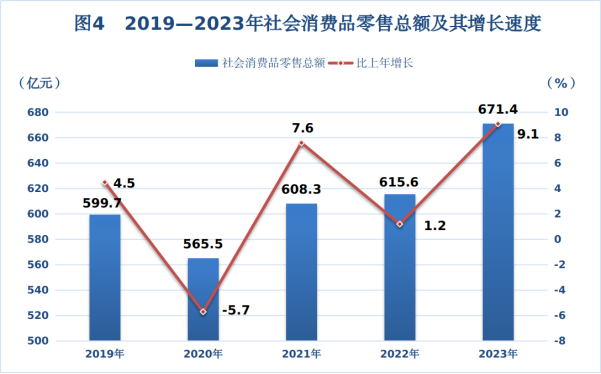 全年社會(huì)消費(fèi)品零售總額671.4億元,同比增長(zhǎng)9.1%。其中,城鎮(zhèn)消費(fèi)品零售額586.0億元,同比增長(zhǎng)9.4%;鄉(xiāng)村消費(fèi)品零售額85.4億元,同比增長(zhǎng)6.9%。