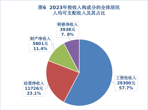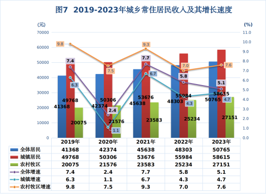 全年全體居民人均可支配收入50765元,同比增長(zhǎng)5.1%。按常住地分,城鎮(zhèn)常住居民人均可支配收入58615元,同比增長(zhǎng)4.7%。從主要收入構(gòu)成看,工資性收入37845元,同比增長(zhǎng)4.0%;經(jīng)營(yíng)凈收入10227元,同比增長(zhǎng)6.5%;財(cái)產(chǎn)凈收入6352元,同比增長(zhǎng)3.2%;轉(zhuǎn)移凈收入4191元,同比增長(zhǎng)9.8%。農(nóng)村牧區(qū)常住居民人均可支配收入27151元,同比增長(zhǎng)7.6%。從主要收入構(gòu)成看,工資性收入5543元,同比增長(zhǎng)8.5%;經(jīng)營(yíng)凈收入14837元,同比增長(zhǎng)7.4%;財(cái)產(chǎn)凈收入3716元,同比增長(zhǎng)5.1%;轉(zhuǎn)移凈收入3055元,同比增長(zhǎng)10.3%。