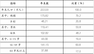 年末全市常住人口222.03萬人,比上年末增加1.96萬人。其中,城鎮(zhèn)人口175.82萬人,比上年末增加3.95萬人;鄉(xiāng)村人口46.21萬人,比上年末減少1.99萬人。常住人口城鎮(zhèn)化率達(dá)79.19%,比上年提高1.09個(gè)百分點(diǎn)。全年出生人口1.40萬人,出生率為6.34‰;死亡人口1.46萬人,死亡率為6.62‰;人口自然增長(zhǎng)率下降0.27‰。