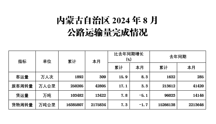 內(nèi)蒙古自治區(qū)2024年8月公路運輸量完成情況