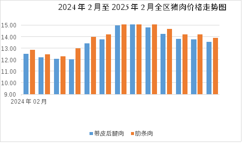 ?2月份我區(qū)豬肉價格持續(xù)下降。其中豬帶皮后腿肉價格各旬環(huán)比漲跌幅度分別為-0.07%、-2.24%、-1.55%,豬肋條肉價格各旬環(huán)比漲跌幅度分別為-0.07%、-3.44%、-0.44%。豬帶皮后腿肉、豬肋條肉2月全區(qū)平均零售價格分別為每500克13.55元、13.89元。環(huán)比,豬帶皮后腿肉、豬肋條肉價格分別下降1.67%、2.05%。同比豬帶皮后腿肉、豬肋條肉價格分別上漲8.14%、7.93%。