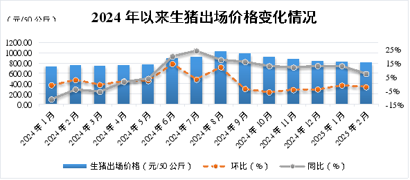 ?2月份,全區(qū)生豬平均出場(chǎng)價(jià)格為807.50元/50公斤,與1月份相比(下稱(chēng)環(huán)比)下降2.60%,與2024年2月份相比(下稱(chēng)同比)上升7.06%。春節(jié)后生豬進(jìn)入傳統(tǒng)消費(fèi)淡季,下游采購(gòu)速度明顯放緩,而養(yǎng)殖端節(jié)前壓欄生豬集中出欄,市場(chǎng)存在一定的供應(yīng)壓力,生豬出場(chǎng)價(jià)格小幅下降。從監(jiān)測(cè)周期來(lái)看,2月5日、12日、19日、26日全區(qū)每50公斤生豬平均出場(chǎng)價(jià)格分別為824.40元、806.83元、802.35元、796.42元。