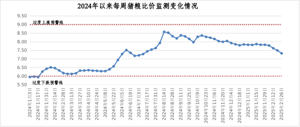 ?隨著生豬出場(chǎng)價(jià)格小幅下降及玉米價(jià)格小幅回升,我區(qū)豬糧比價(jià)保持在合理區(qū)間窄幅下行,2月5日、12日、19日、26日全區(qū)豬糧比價(jià)分別為7.78:1、7.62:1、7.49:1、7.32:1。