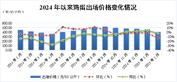 ?2月份全區(qū)每50公斤雞蛋平均出場(chǎng)價(jià)格為399.63元,環(huán)比下降12.81%,同比下降3.27%。春節(jié)后,雞蛋消費(fèi)階段性轉(zhuǎn)淡,餐飲及食品加工企業(yè)補(bǔ)貨節(jié)奏放緩,且家庭也以消化節(jié)前囤貨為主,雞蛋市場(chǎng)交易較為平淡,出場(chǎng)價(jià)格小幅下降。從監(jiān)測(cè)周期來(lái)看,2月5日、12日、19日、26日全區(qū)每50公斤雞蛋平均出場(chǎng)價(jià)格分別為441.10元、398.93元、380.50元、378.00元,周環(huán)比降幅逐步收窄。
