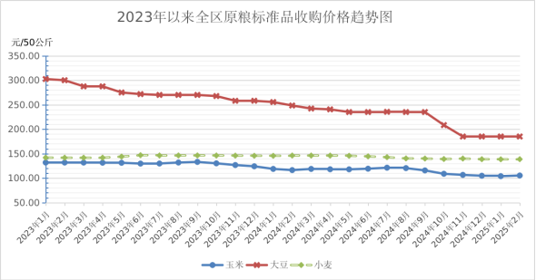 2025年2月份,全區(qū)小麥、玉米收購(gòu)價(jià)格走勢(shì)出現(xiàn)上行,大豆收購(gòu)價(jià)格持平;與去年同期相比,小麥、玉米、大豆收購(gòu)價(jià)格降幅較上月均有所收窄。