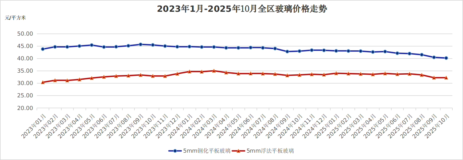 ?5mm浮法平板玻璃、5mm鋼化平板玻璃10月份平均價(jià)格分別為每平方米32.21元、40.14元。環(huán)比,5mm浮法平板玻璃持平,5mm鋼化平板玻璃價(jià)格略降0.69%;同比分別下降3.37%、6.47%。