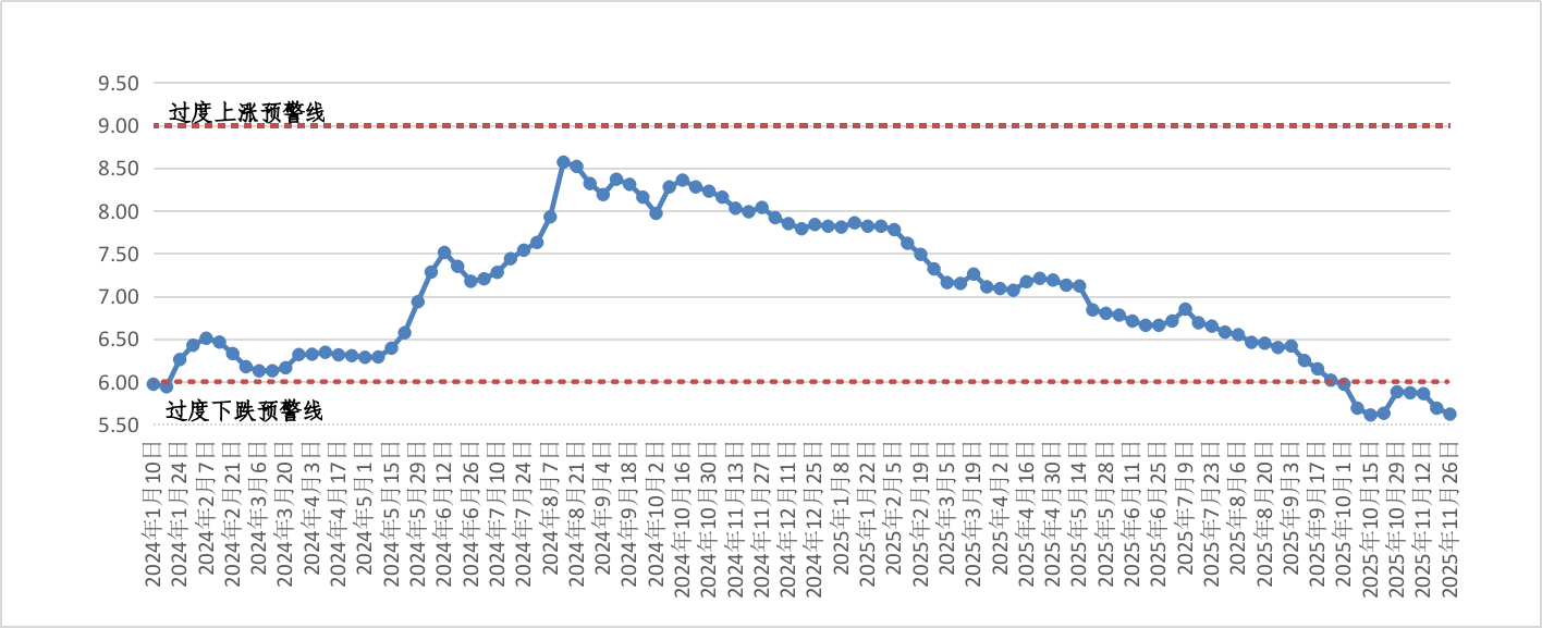 11月份,受生豬出場價(jià)格下降及玉米批發(fā)價(jià)格波動影響,我區(qū)豬糧比價(jià)小幅下行。11月5日、12日、19日、26日全區(qū)豬糧比價(jià)分別為5.87:1、5.86:1、5.69:1、5.62:1,處于過度下跌三級預(yù)警區(qū)間。