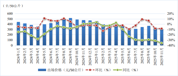 11月份,全區(qū)生豬平均出場價(jià)格為630.42元/50公斤,與10月份相比(以下簡稱環(huán)比)下降1.59%,較上月收窄7.19個(gè)百分點(diǎn);與2024年11月份相比(以下簡稱同比)下降28.12%。從周監(jiān)測情況看,11月5日、12日、19日、26日全區(qū)每50公斤生豬平均出場價(jià)格分別為639.25元、638.25元、626.00元、618.17元,呈現(xiàn)小幅下降態(tài)勢。11月份,生豬市場供應(yīng)仍處高位,需求有所走強(qiáng),生豬市場交易氛圍回暖,出場價(jià)格降幅收窄。
