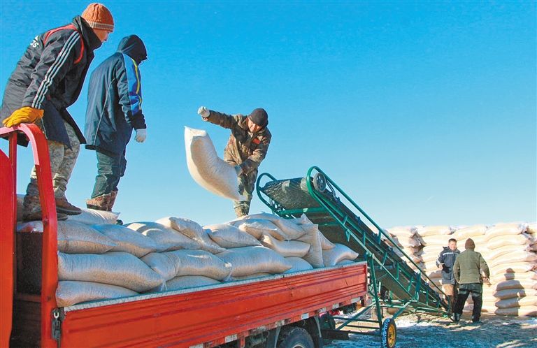 牧戶們前來(lái)領(lǐng)取分紅飼料。