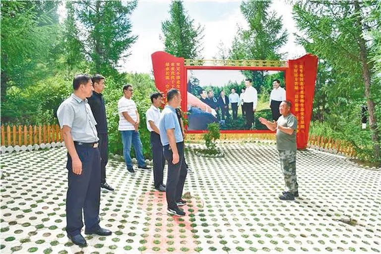 生態(tài)好了,來這里旅游的人也多了。一上午的時間,這里已經(jīng)迎來了好幾撥周邊地區(qū)過來的游客。他們沿著小道,走到林場深處的一處平地。一張巨幅照片格外醒目,那是2019年7月15日,習近平總書記在林場與護林員交流的場景,兩側還配有總書記關于生態(tài)保護的殷切囑托。如今總書記攀登過的這條護林小道已成為一個紅色教育基地。