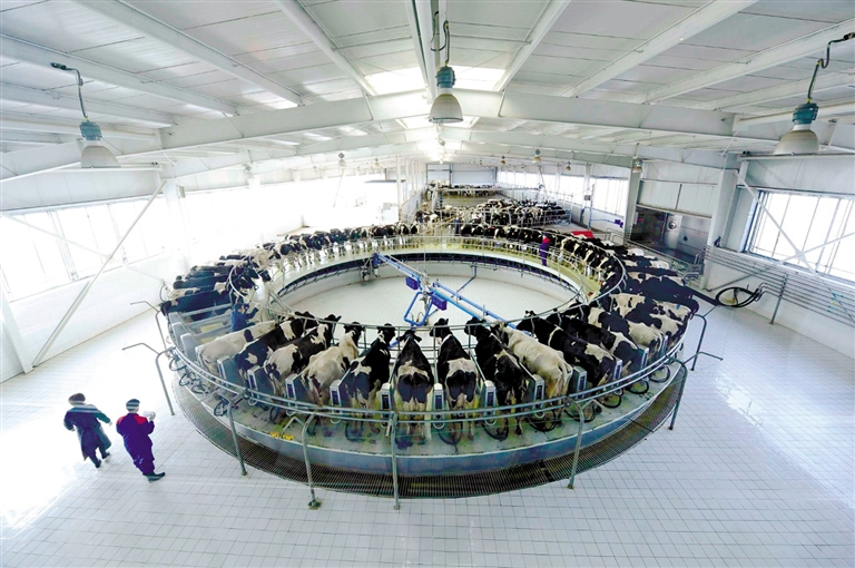 伊利敕勒川精品奶源基地內(nèi),國(guó)際化先進(jìn)轉(zhuǎn)盤式擠奶設(shè)備吸引參觀者目光。