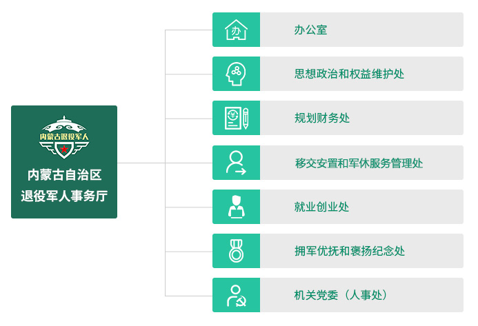 機(jī)構(gòu)設(shè)置:內(nèi)設(shè)綜合科、權(quán)益與信訪(fǎng)科、軍休與安置科、自主擇業(yè)與企業(yè)軍轉(zhuǎn)科、就業(yè)創(chuàng)業(yè)培訓(xùn)科、優(yōu)撫褒揚(yáng)科、信息科7個(gè)科室。