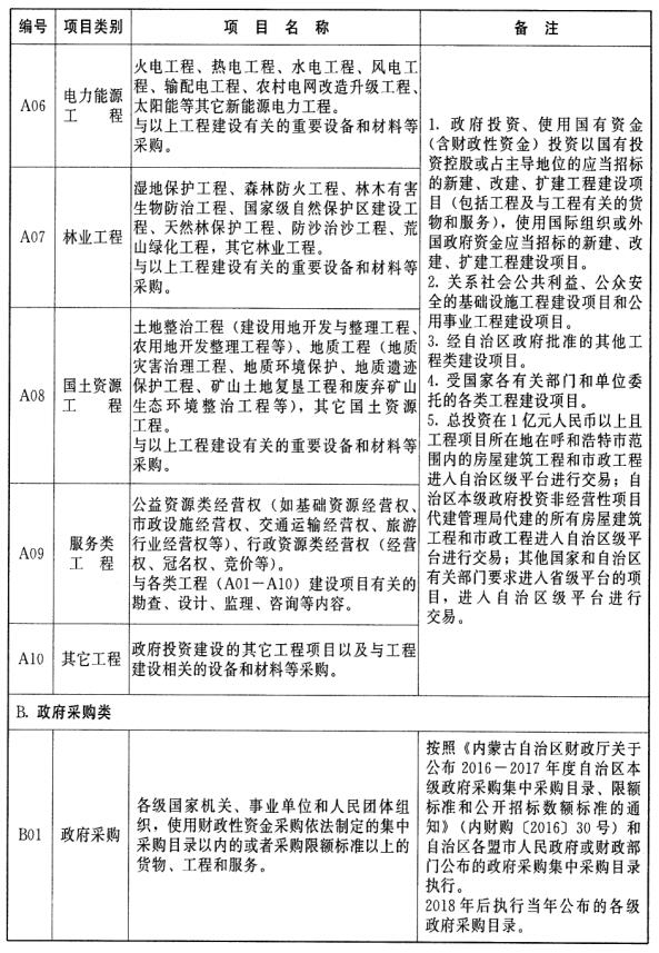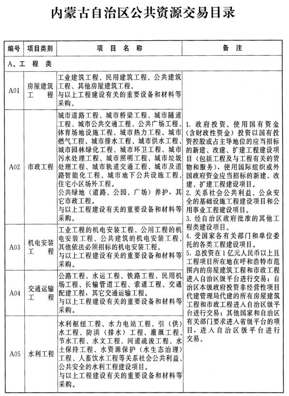 按照《內(nèi)蒙古自治區(qū)公共資源交易平臺管理服務實施細則》(內(nèi)政發(fā)〔2017〕60號文件)的有關(guān)要求,經(jīng)自治區(qū)人民政府同意,現(xiàn)發(fā)布《2017-2018年度內(nèi)蒙古自治區(qū)公共資源交易目錄》(以下簡稱《目錄》),并就有關(guān)事項通知如下: