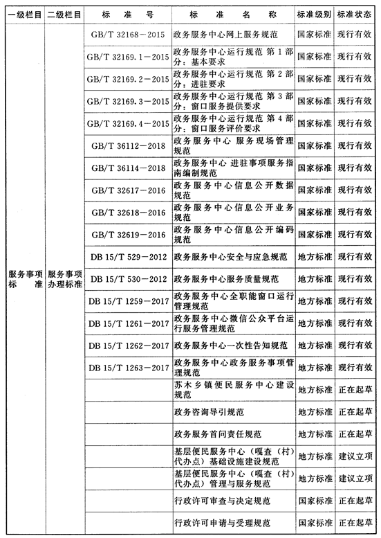 服務(wù)事項辦理標準主要包括網(wǎng)上政務(wù)服務(wù)標準、實體政務(wù)服務(wù)標準和線上線下一體化標準。該類標準規(guī)范了1)實體政務(wù)中心的基礎(chǔ)設(shè)施條件、進駐部門、辦理事項、提供服務(wù)等;2)網(wǎng)上服務(wù)事項的注冊、分類、辦理、查詢、評價、互動等;3)線上線下一體化的服務(wù)范圍、總體服務(wù)要求、各類事項的服務(wù)要求等。