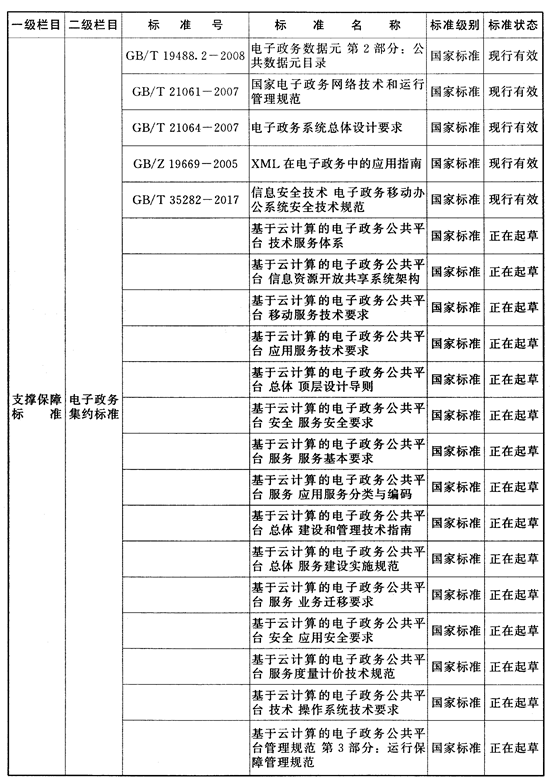 電子政務(wù)集約化標準主要包括電子政務(wù)公共服務(wù)云平臺的應(yīng)用遷移、應(yīng)用部署、服務(wù)目錄、功能和性能技術(shù)要求、接口技術(shù)要求、實施要求、測試規(guī)范、安全要求等。該類標準規(guī)范了電子政務(wù)公共服務(wù)云平臺的術(shù)語、功能性能要求、服務(wù)提供要求、遷移部署要求等內(nèi)容,加速推進了電子政務(wù)集約化建設(shè)。