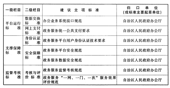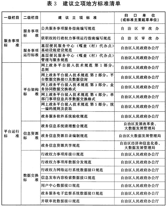 通過梳理自治區(qū)“互聯(lián)網(wǎng)+政務(wù)服務(wù)”標準明細表,對自治區(qū)急需制定的地方標準進行匯總,形成表3。