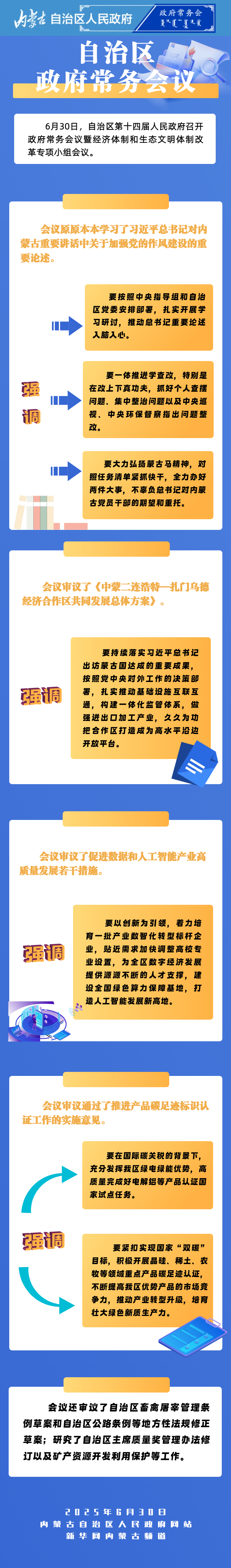 6月30日,自治區(qū)第十四屆人民政府召開政府常務(wù)會(huì)議暨經(jīng)濟(jì)體制和生態(tài)文明體制改革專項(xiàng)小組會(huì)議。