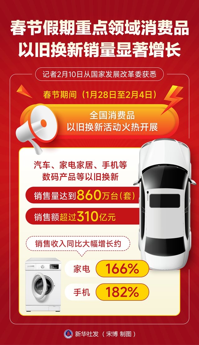 記者2月10日從國家發(fā)展改革委獲悉,春節(jié)期間(1月28日至2月4日),全國消費品以舊換新活動火熱開展,汽車、家電家居、手機等數(shù)碼產(chǎn)品等以舊換新銷售量達到860萬臺(套)、銷售額超過310億元,家電、手機銷售收入同比大幅增長約166%、182%,消費市場活力有效提升。